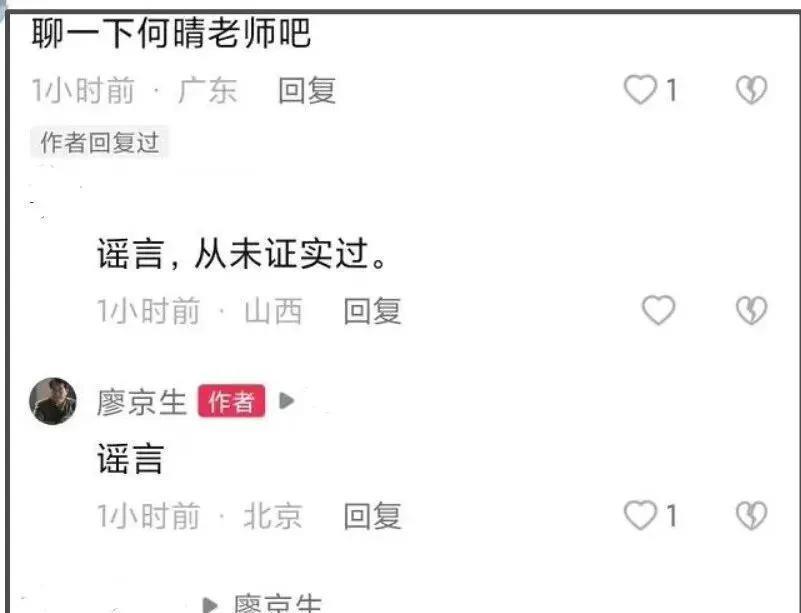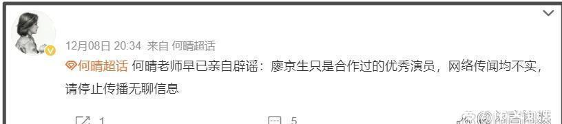 何晴超话主持 月 8 日发布联合声明,透露何晴生前曾在私下采访中多次否认该传闻,强调廖京生仅为合作过的演员,二人无任何亲密关系。